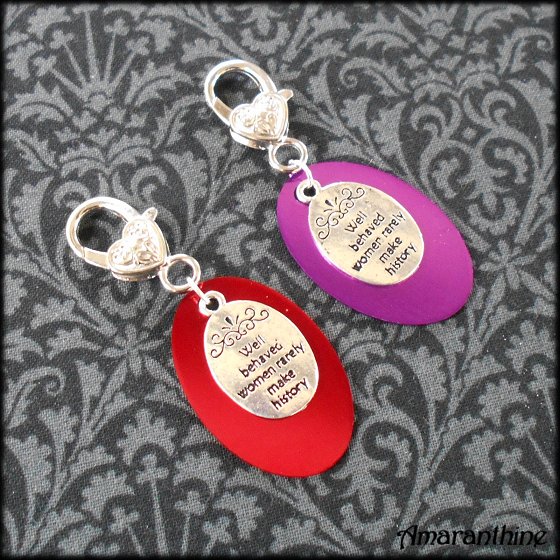 Handmade clip for adding to a handbag or keyring – featuring “Well behaved women seldom make history” charm.