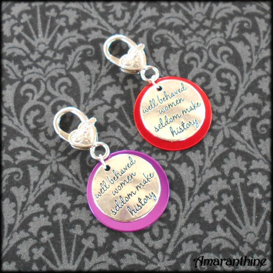 Handmade clip for adding to a handbag or keyring – featuring “Well behaved women seldom make history” charm.