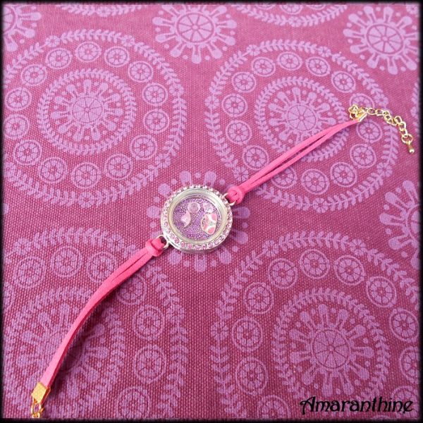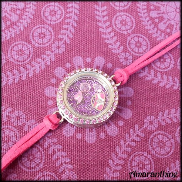 Metal & glass magnetic closure locket filled with microbeads and faux crystals with a pink hat charm.