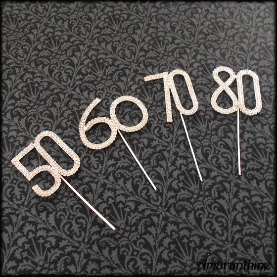 Silvery metal with clear rhinestone number. 50 measures approx 5cm high, 10cm high including stick.