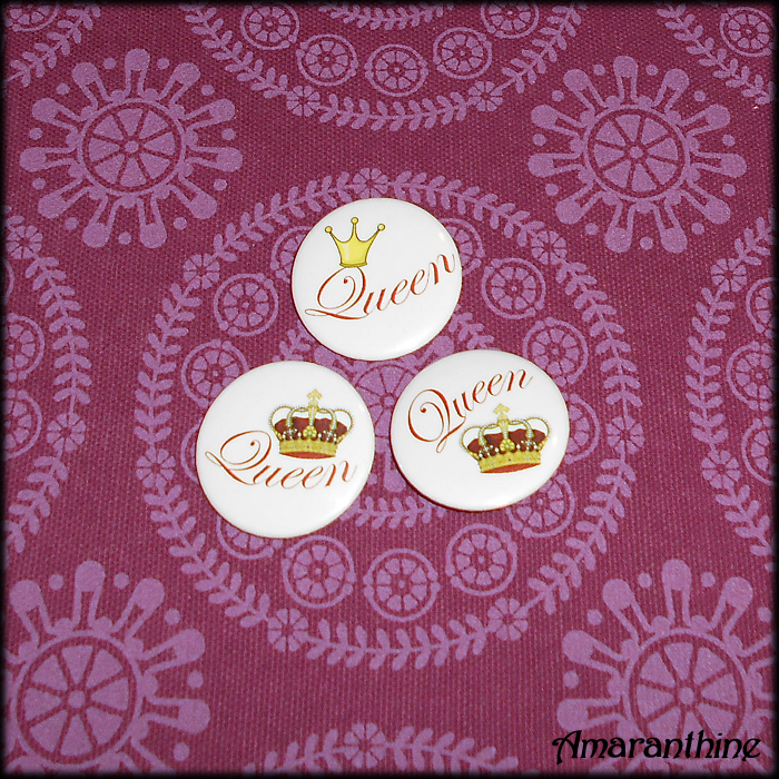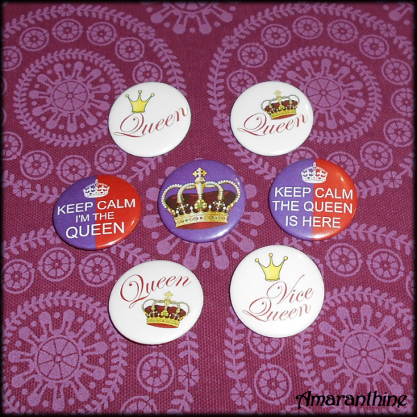 Set includes: 1 x Crown, 1 x “Keep Calm I’m the Queen”, 1 x “Keep Calm the Queen is here”, 1 x Vice Queen, 1 x Queen (your choice from the 3 Queen designs).