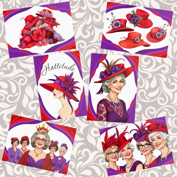 Glossy Red Hatter themed Postcards. Sold Separately. Each design pictured below: